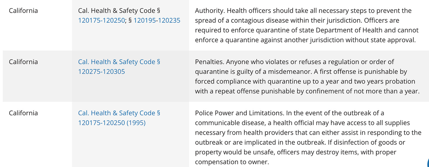 If you click on any of the photos above, you will be taken to State Quarantine and Isolation Statutes at the National Conference of State Legislatures site. From there, you can click on any of the hyperlinked statute citations to read the entire statute.