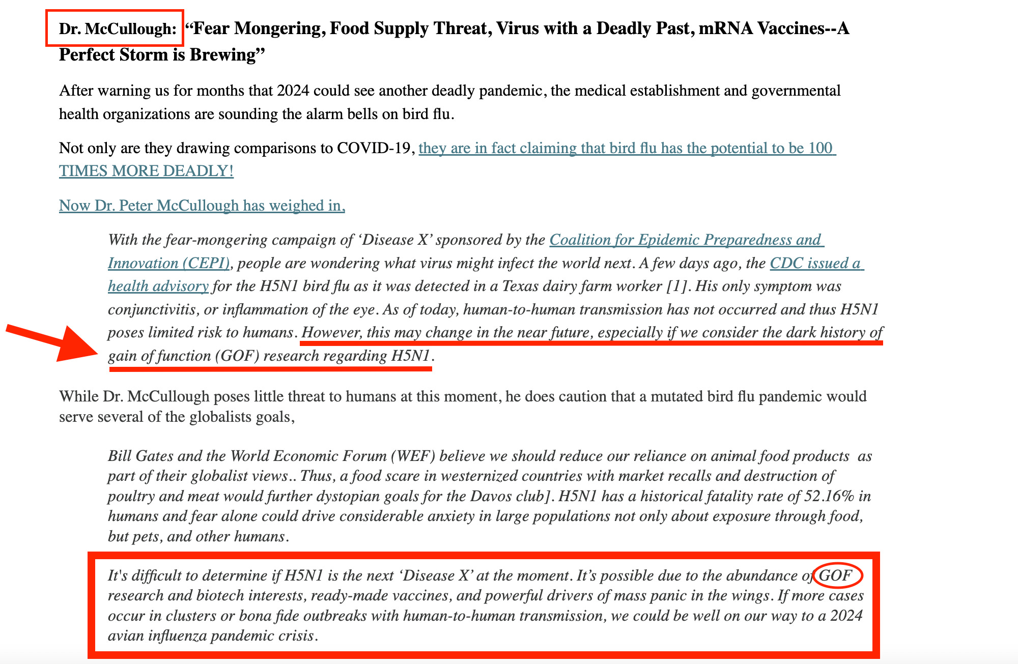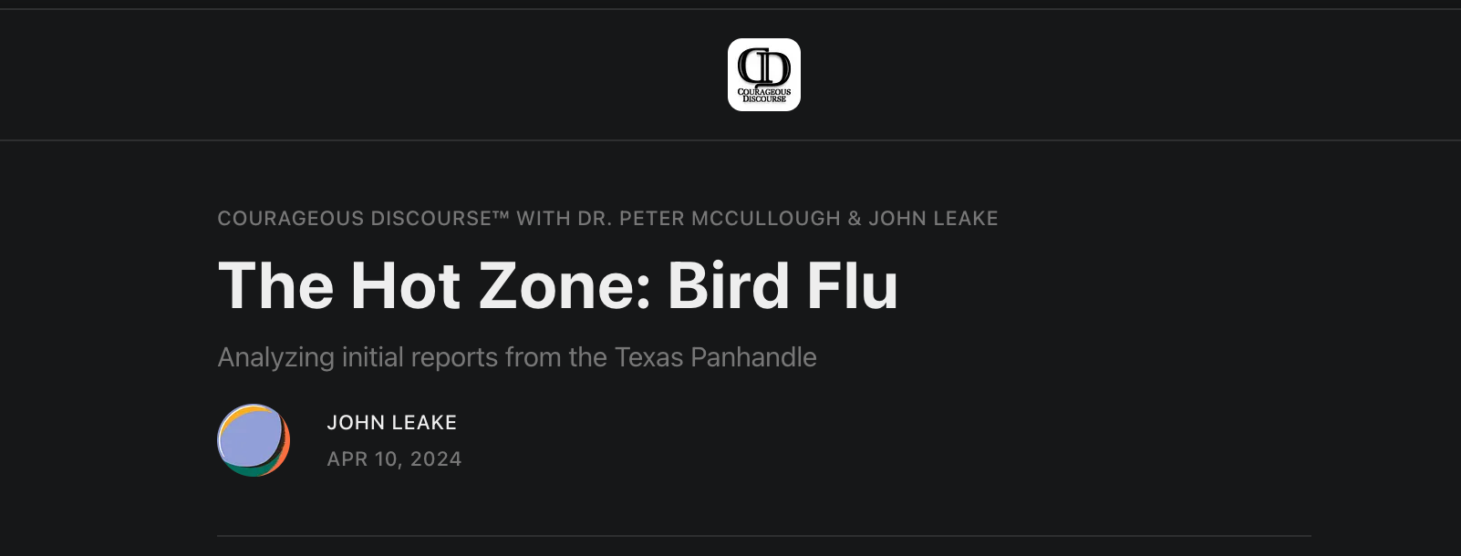 I did you a solid and listened to Peter McCullough and his handler, John Leake’s, “Hot Zone” podcast earlier this week. They apparently decided to do an early broadcast due to the “rapidly progressing” bird flu…thing.