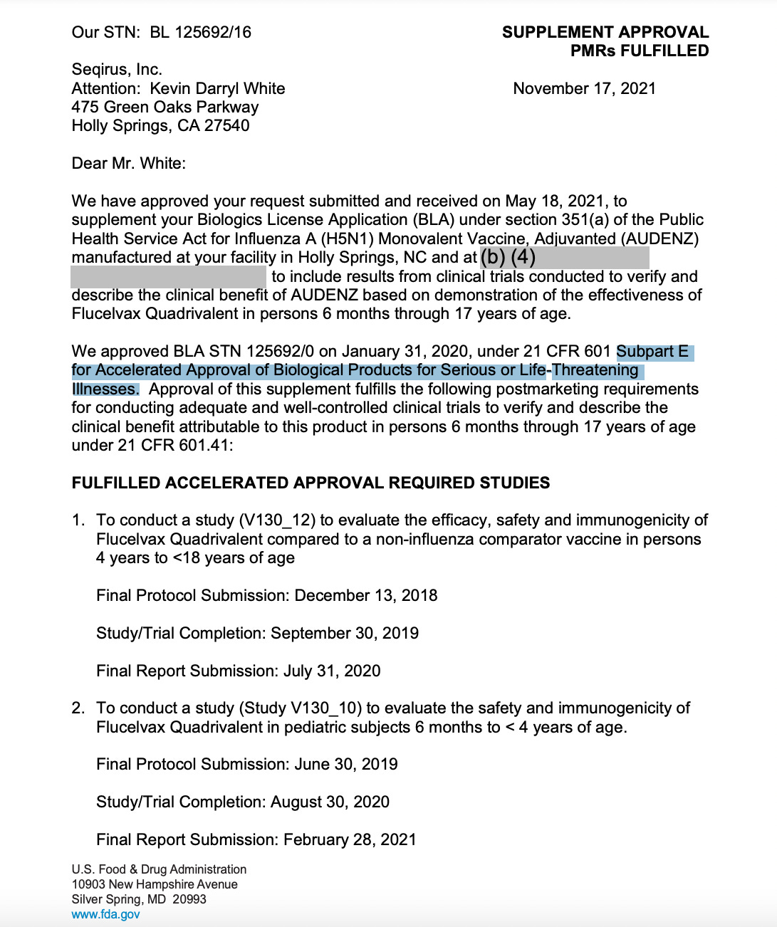 and and their extensive archives regarding the legal and regulatory structures in place.Turns out the FDA has already approved the avian flu vaccine “under 21 CFR 601 Subpart E for Accelerated Approval of Biological Products for Serious or Life-Threatening Illnesses” .