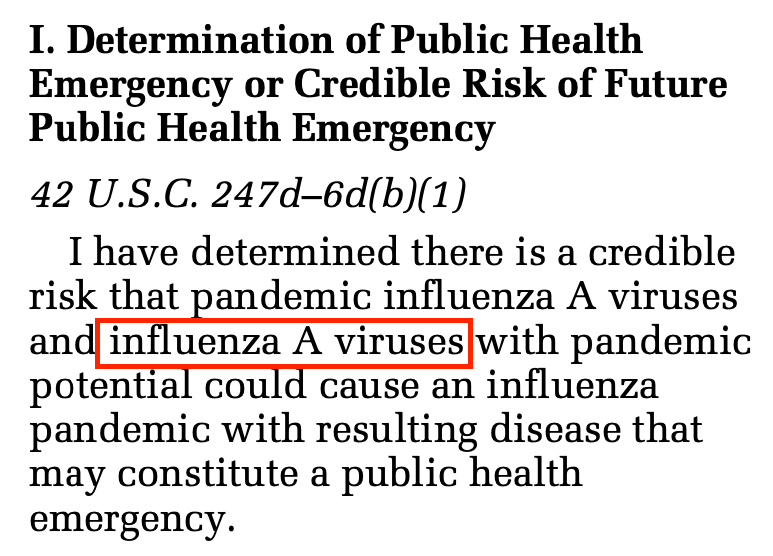 I am prefacing my post with this friendly reminder that we are under a PREP Act Declaration for Influenza until at least December 2027. That means that the sweeping liability immunity for all the herd culling bullshit medical countermeasures that we saw with Covid, applies to Influenza.