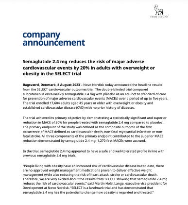 FOR ADULTS WITH OVERWEIGHT OR OBESITY AND ESTABLISHED CARDIOVASCULAR DISEASE IN THE SELECT TRIAL.