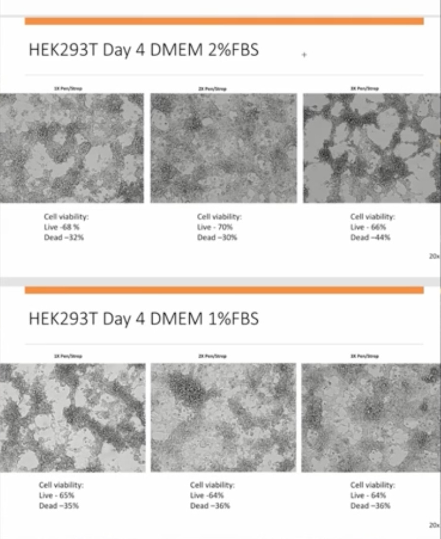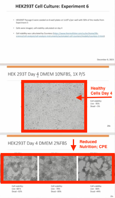 In Part 6 of the Cell Culture Experiment, the culture was kept at 10% FBS through Day 4, while maintaining all other variables. As you can see, on Day 4 the cells are viable with the live cell count at 95%. Contrast that with the images directly below it, showing significant CPE on the same day with FBS at 2%. The only difference between the cultures was the concentration of FBS. This indicates that nutrient restriction alone is able to cause the cytopathic effect. This finding is compelling because nutrient reduction is a standard step in the cell culture method.